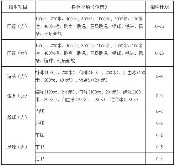 招生项目:田径、游泳、男子篮球、男子足球。