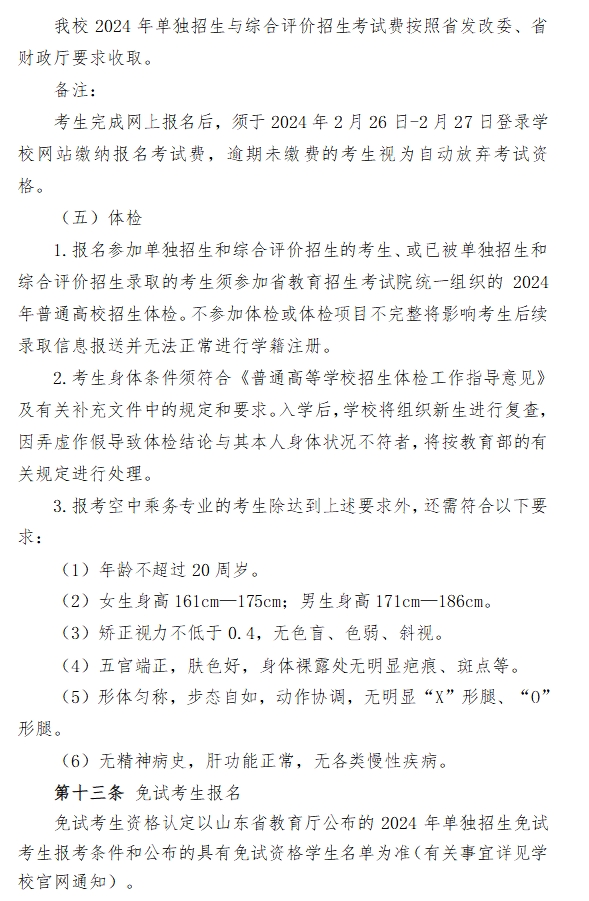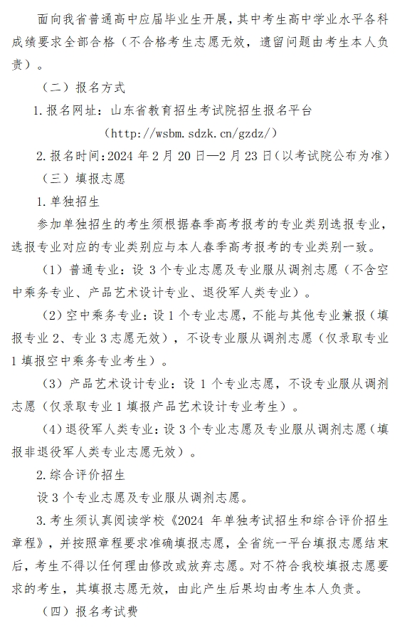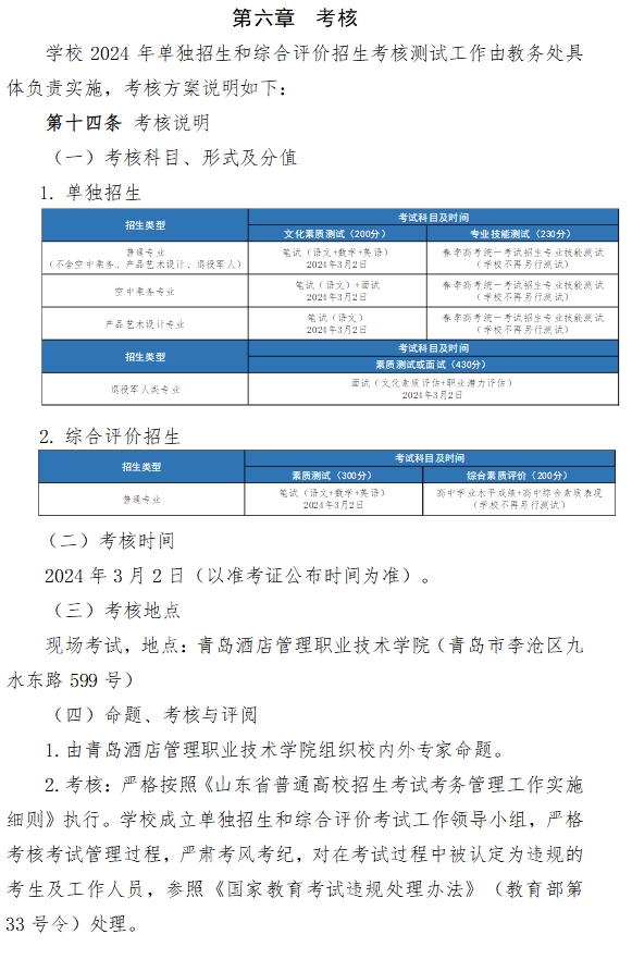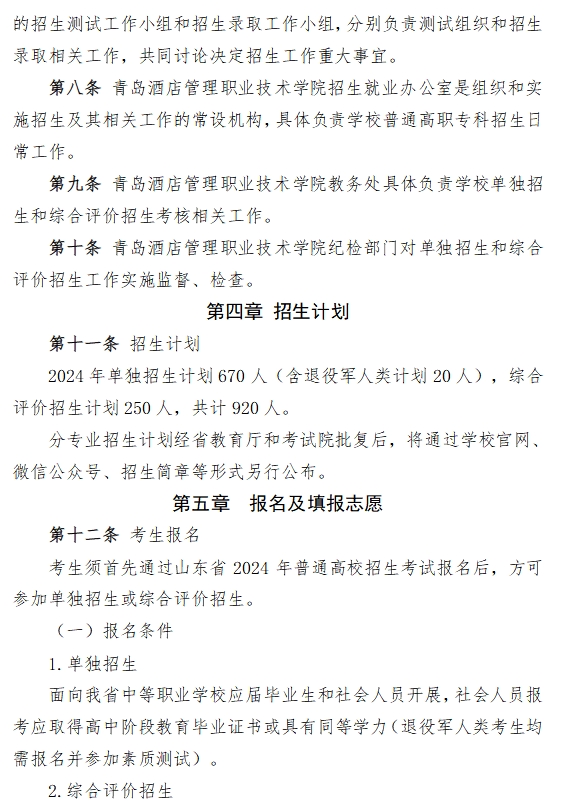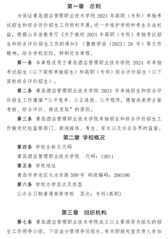 青岛酒店管理职业技术学院2024年高职(专科)单独考试招生和综合评价招生章程