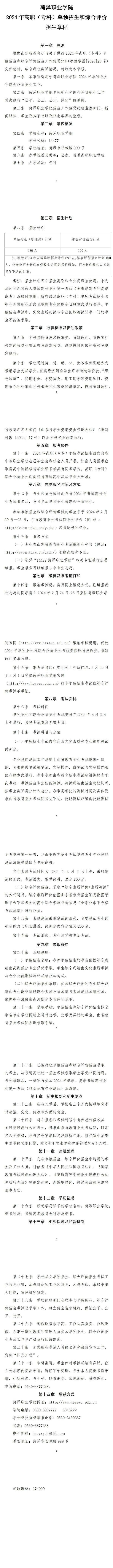2、菏泽职业学院2024年招生章程